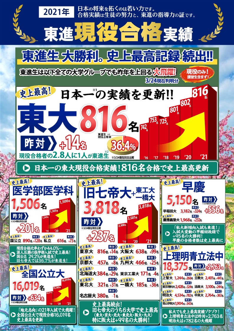 ② 日本一の合格実績。2021年東大816名・京大451名・九大399名合格。(3/14判明分)